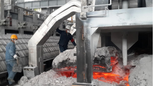 待多功能天車將殘極調出,趙德福高溫下的"高溫作業(yè)"才算正式開始。因為殘極調出后裸露出火紅的、溫度高達900多攝氏度的爐膛。趙德福用大勾、大耙等工具將大小不一的殘極塊一一撈出,確認爐膛干凈后,指揮多功能天車裝入新陽極,張壽昌、劉強負責添加保溫料、殼面整形等。