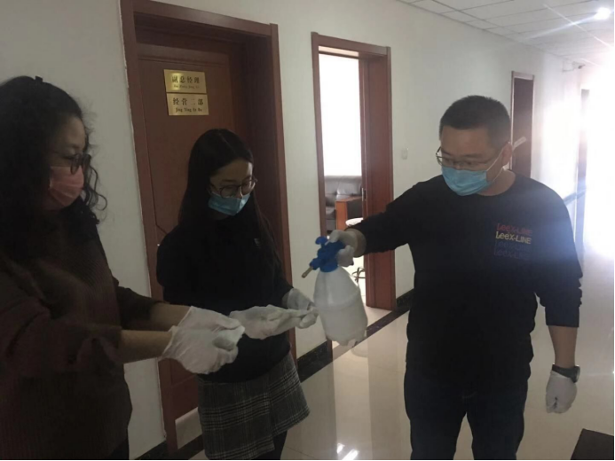 守護職工筑牢"安全防線":物產配送公司黨委通過配發酒精40公斤、84消毒液6瓶、消毒濕巾等防控器具,及時組織黨員指導職工進行防控工作,重點對宿舍、辦公室、值班室、洗手間門把手、辦公桌椅等進行噴灑消毒。